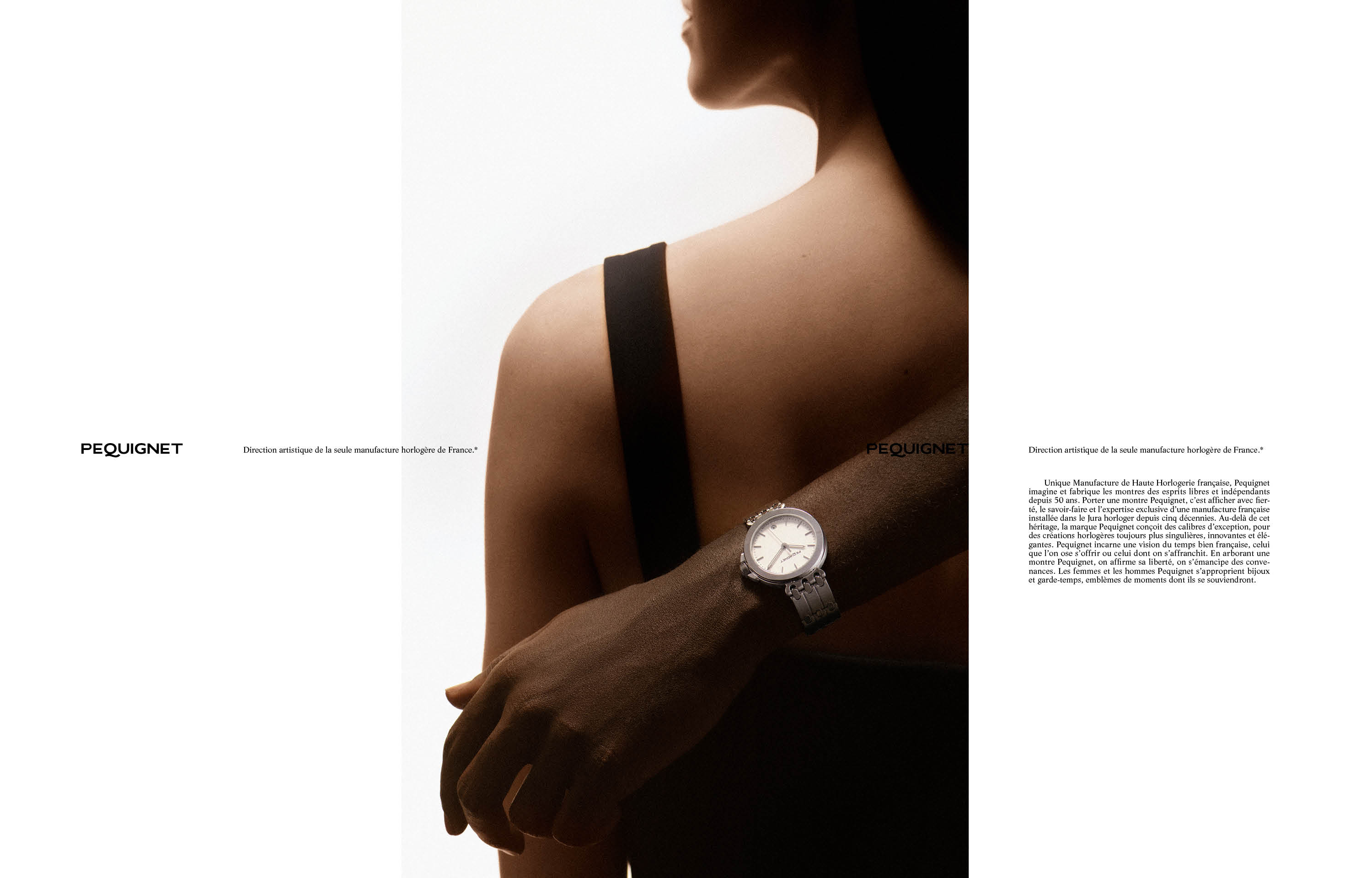 En 2021, le fond éthique et familial Enowe reprend la marque de montre française Pequignet afin de la remettre sur le devant de la scène. "Pequignet, c’est l’alliance indissociable de l’esthétique et de la technique. Toujours l’un avec l’autre, mais jamais l’un sans l’autre. Une histoire d’assemblage et d’équilibre. Une manière de donner vie à un savoir-faire, avec style." Séduit par la complémentarité de nos profils, la marque nous confie la direction artistique de ses collections et de son image. Depuis 2022, nous travaillons ensemble à harmoniser, révéler et inventer l'imaginaire de Pequignet : que ce soit dans un cadran de montre, une vidéo 3D, une campagne publicitaire, un shooting photo, un dossier de presse ou une boutique.